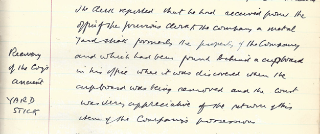 The Clerk reported that he had received from the office of the previous Clerk of the Company a metal yardstick previously the property of the Company and which had been found behind a cupboard in his office, where it was discovered when the cupboard was being removed and the Court was very appreciative of the return of this item of the Company’s possessions.